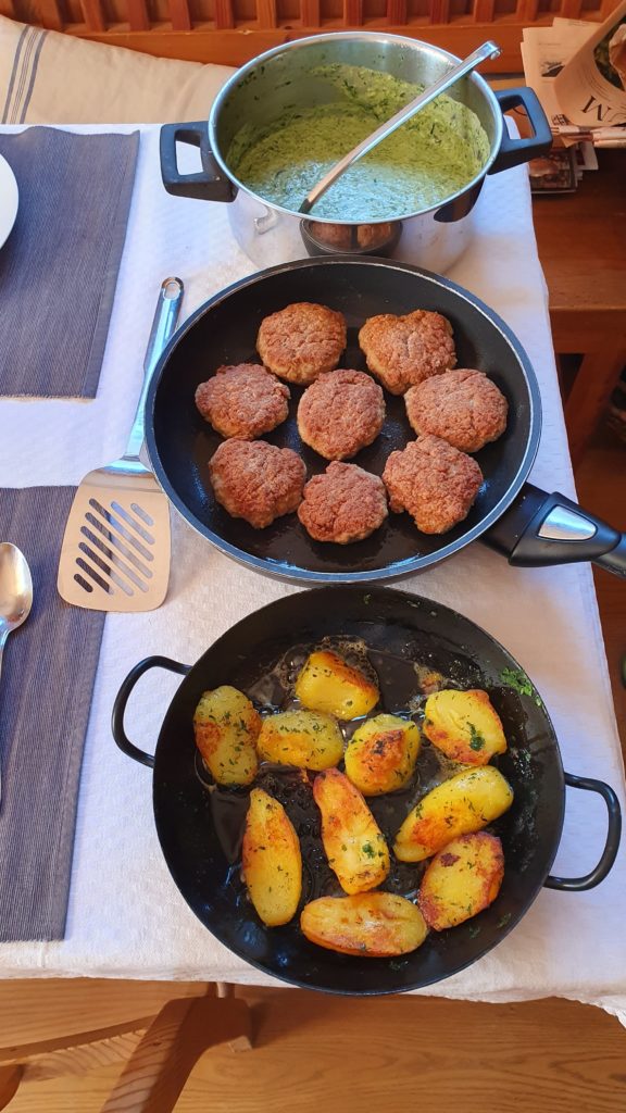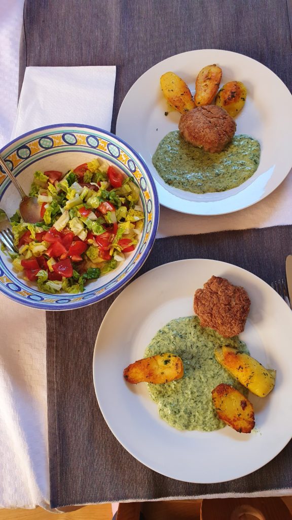 Aus dem Bärlauch kochten wir am Sonntag einerseits eine cremige Suppe und heute den Spiegel für die Faschierten Labalan/Leibchen, serviert mit Bratkartoffeln und gemischten Salat.