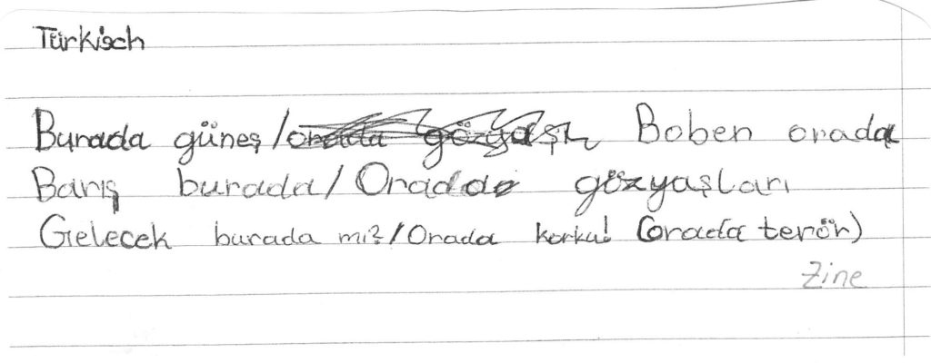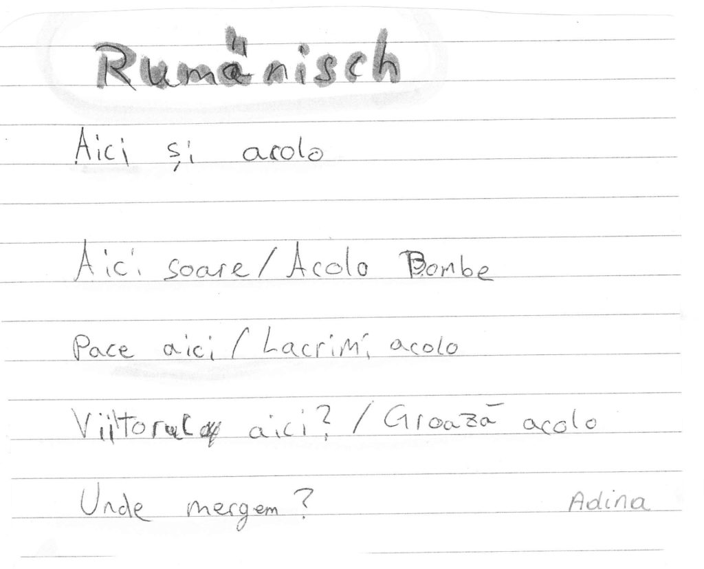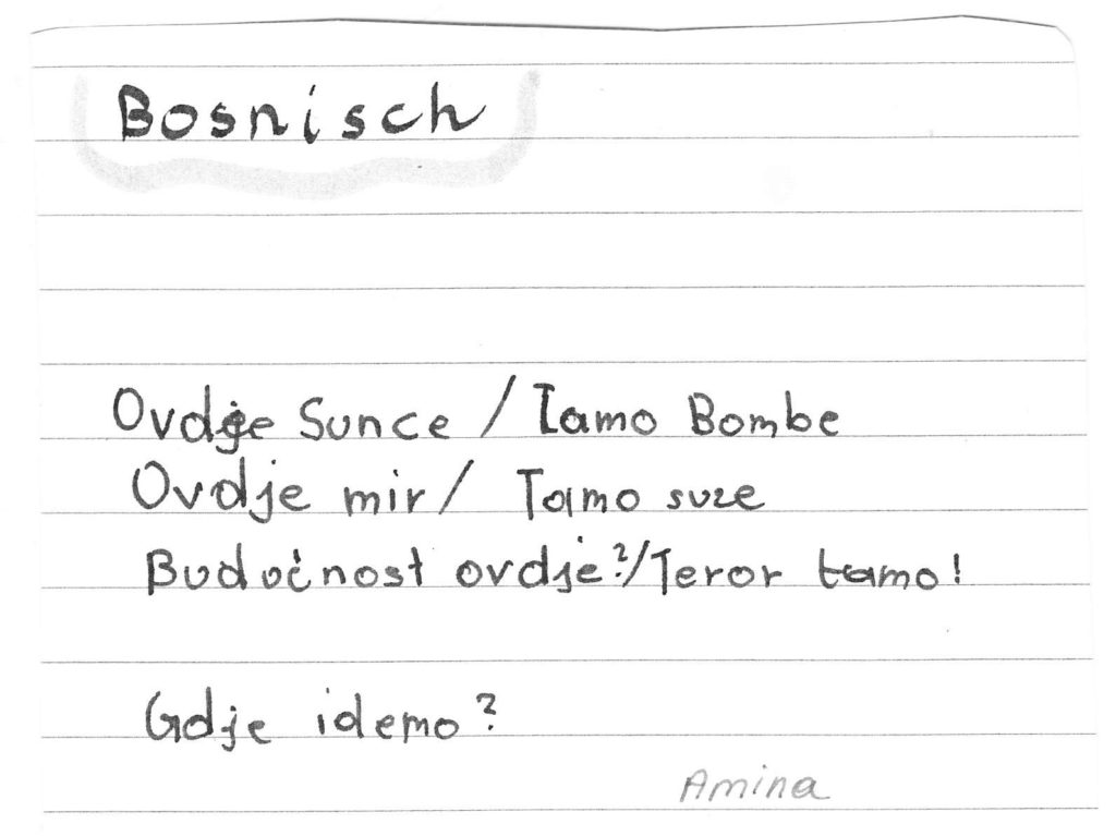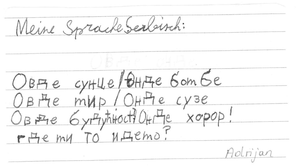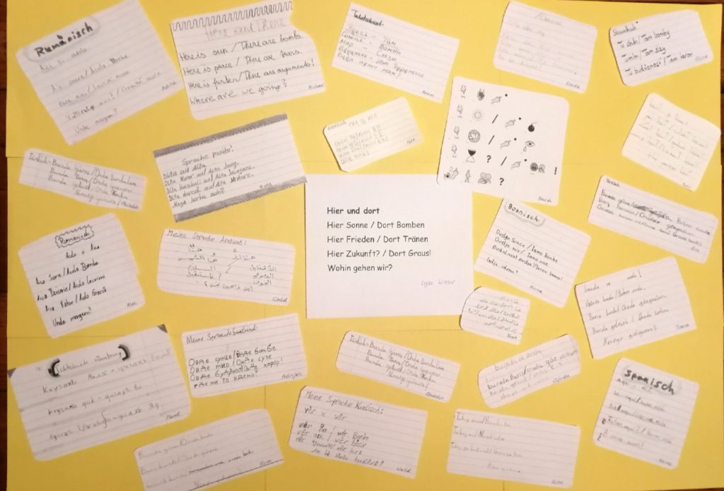 Auch wir, die 1b-Klasse der Mittelschule Dr. Renner in Graz, haben Ihr Gedicht im Unterricht besprochen. So eifrig wie noch nie wurde das Gedicht daraufhin als Hausübung von den Kindern – teils gemeinsam mit den Eltern und Geschwistern – in die unterschiedlichen Herkunftssprachen übersetzt. Rund fünfzehn verschiedensprachige Interpretationen des Gedichts kamen am Ende dabei raus, eine davon mithilfe einer Sprach-App in „Metacom-Symbolen“. Vielen Dank für diese Inititative!